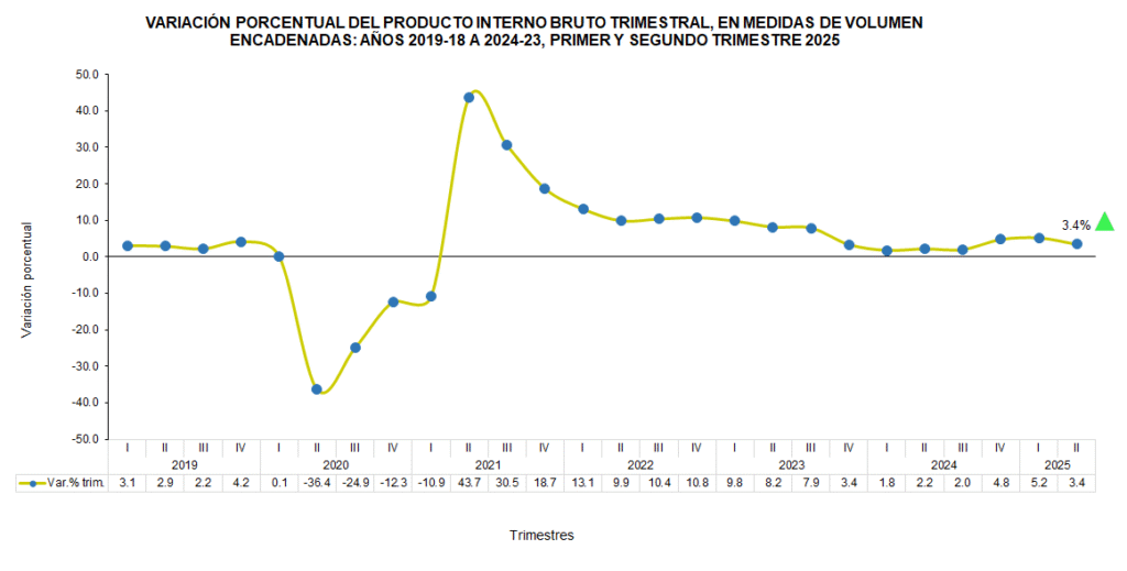 La economía panameña mantuvo un ritmo positivo en la primera mitad de 2025, con un crecimiento acumulado del 4.4% del Producto Interno Bruto (PIB), equivalente a B/.40,379.6 millones a precios constantes de 2018. El incremento fue de B/.1,689.8 millones respecto al mismo periodo de 2024. Sin embargo, la dinámica mostró cierta desaceleración: el PIB creció 5.2% en el primer trimestre, pero moderó su expansión a 3.4% en el segundo trimestre.
