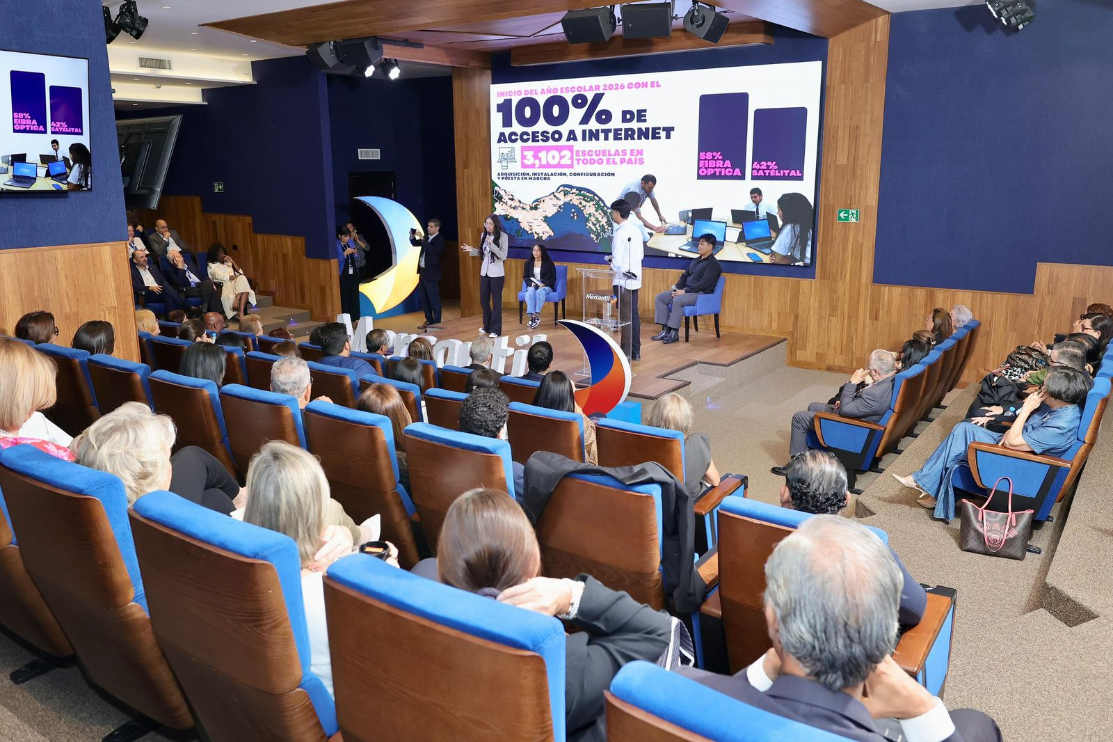 Durante la presentación, la titular del Ministerio de Educación informó que el año lectivo 2026 iniciará con el 100% de acceso a internet en las 3,102 escuelas públicas del país. De ese total, el 58% contará con conexión mediante fibra óptica y el 42% a través de tecnología satelital, lo que busca reducir brechas digitales y fortalecer los procesos de enseñanza-aprendizaje a nivel nacional.
