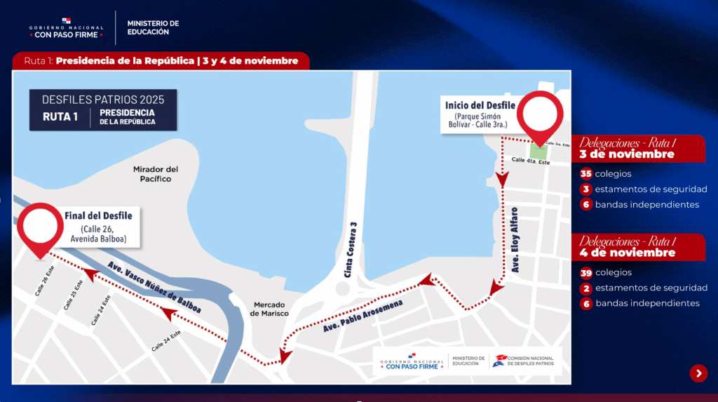 El desfile del 3 de noviembre —día de la separación de Panamá de Colombia— iniciará a las 9:00 a.m., mientras que el del 4 de noviembre, dedicado a los Símbolos Patrios, arrancará a las 8:00 a.m.