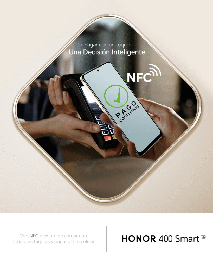 En este contexto de transformación digital, dispositivos como el HONOR 400 Smart se posicionan como herramientas clave para facilitar pagos rápidos, seguros y sin complicaciones. Gracias a su tecnología NFC, los usuarios pueden pagar con solo acercar el teléfono a una terminal compatible, sin necesidad de buscar monedas, deslizar tarjetas ni ingresar contraseñas.
