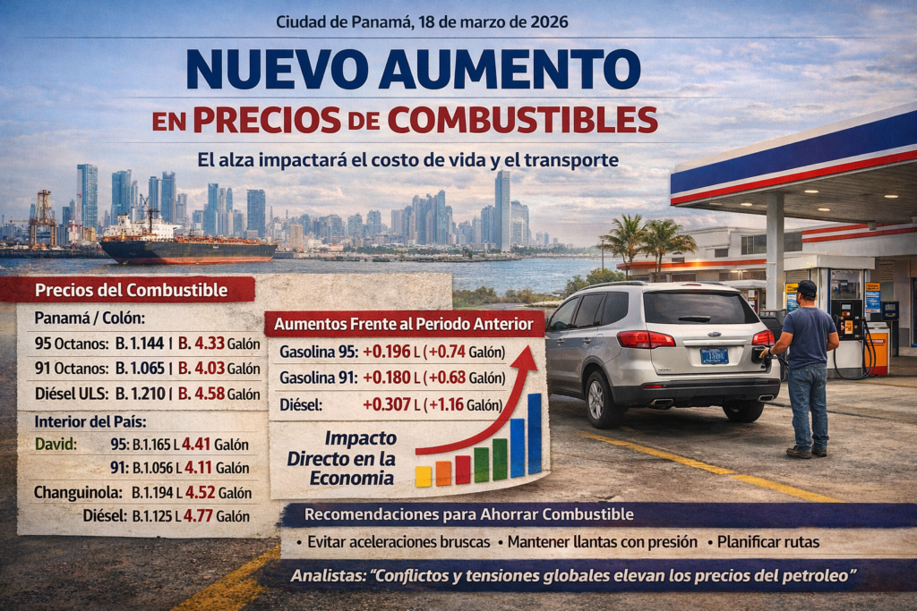 Ciudad de Panamá, 18 de marzo de 2026. La Secretaría de Energía anunció un nuevo ajuste en los precios de los combustibles que regirá del 20 de marzo al 3 de abril de 2026, en medio de presiones internacionales sobre el mercado de hidrocarburos y tensiones geopolíticas que continúan impactando los costos.